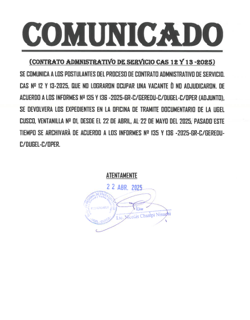 22 Abr 2025 Ugel Cusco Comunicados 22 de abril de 2025 COMUNICADO – OFICINA DE TRAMITE DOCUMENTARIO Anterior Noticia Siguiente Noticia
