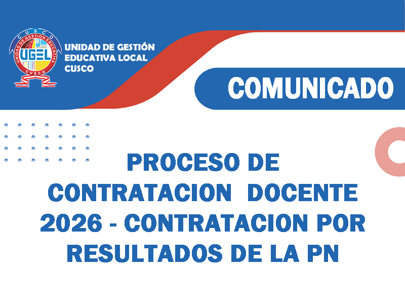 29 Ene 2026 Ugel Cusco Comunicados 29 de enero de 2026 Comunicado – PROCESO DE CONTRATACION DOCENTE 2026 – CONTRATACION POR RESULTADOS DE LA PN VER COMUNICADO Y ANEXOS >>> Anterior Noticia Siguiente Noticia