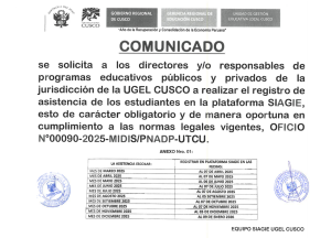 10 Jul 2025 Ugel Cusco Comunicados 10 de julio de 2025 Comunicado – SIAGIE Anterior Noticia Siguiente Noticia