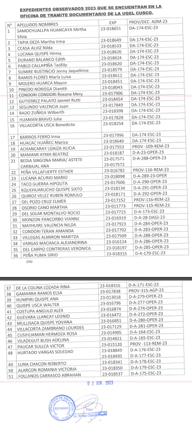 02 Jun 2023 Ugel Cusco Comunicados 2 de junio de 2023 EXPEDIENTES OBSERVADOS 2023 QUE SE ENCUENTRAN EN LA OFICINA DE TRAMITE DOCUMENTARIO DE LA UGEL CUSCO Leer mas… Anterior Noticia Siguiente Noticia
