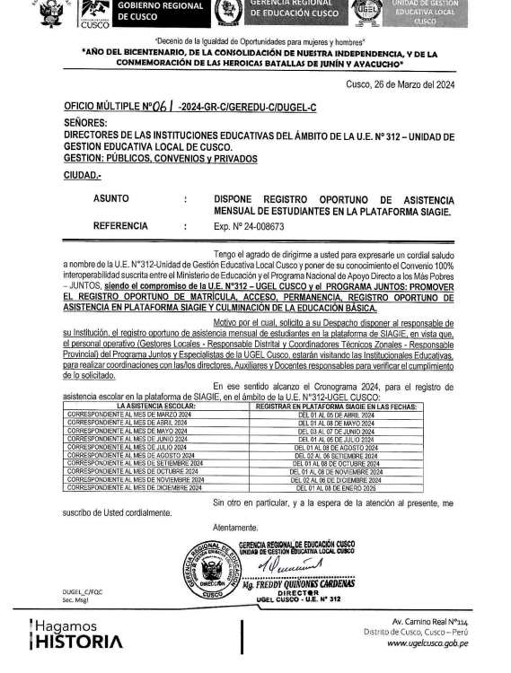 ASUNTO: DISPONE REGISTRO OPORTUNO DE ASISTENCIA MENSUAL DE ESTUDIANTES EN LA PLATAFORMA SIAGIE.