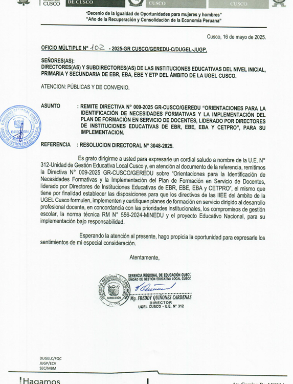 ASUNTO: REMITE DIRECTIVA N° 009-2025 GR-CUSCO/GEREDU, “ORIENTACIONES PARA LA IDENTIFICACIÓN DE NECESIDADES FORMATIVAS Y LA IMPLEMENTACIÓN DEL PLAN DE FORMACIÓN DE SERVICIO DE DOCENTES, LIDERADO POR DIRECTORES DE INSTITUCIONES EDUCATIVAS DE EBR, EBE, EBA Y CETPRO” PARA SU IMPLEMENTACIÓN.