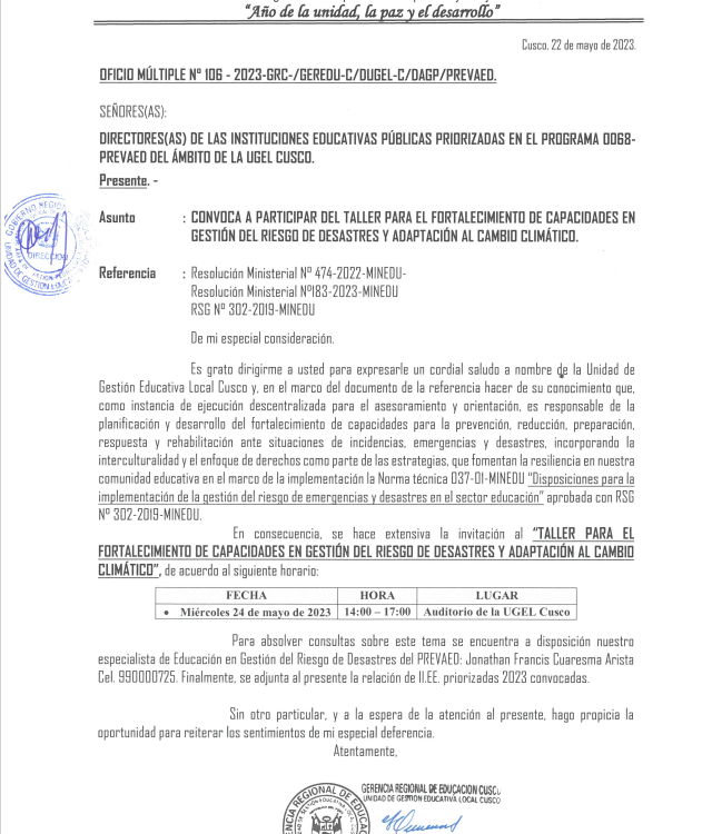 OFICIO MÚLTIPLE N° 106-2023-GRC/GEREDU-C/DAGP/PREVAED