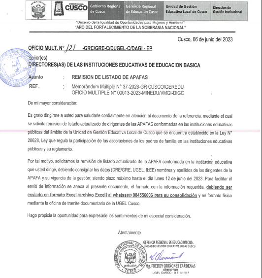 09 Jun 2023 Ugel Cusco Oficios 9 de junio de 2023 OFICIO MULTIPLE N° 121 -GRC/GRE-C/DUGEL-C/DAGO-EP ASUNTO: REMISION DE LISTADO DE APAFA Leer mas … Anterior Noticia Siguiente Noticia