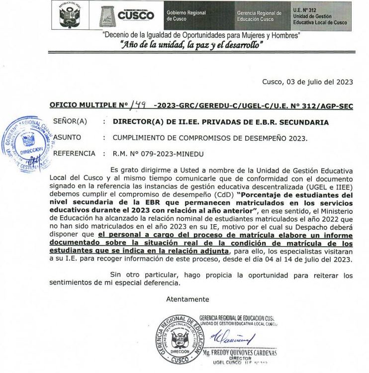 04 Jul 2023 Ugel Cusco Oficios 4 de julio de 2023 OFICIO MÚLTIPLE N° 149 – 2023-GRC/ GEREDU-C/ UGEL-C/ U.E. N° 312 /AGP –SEC. ASUNTO : CUMPLIMIENTO DE COMPROMISOS DE DESEMPEÑO 2023. Leer más Anterior Noticia Siguiente Noticia