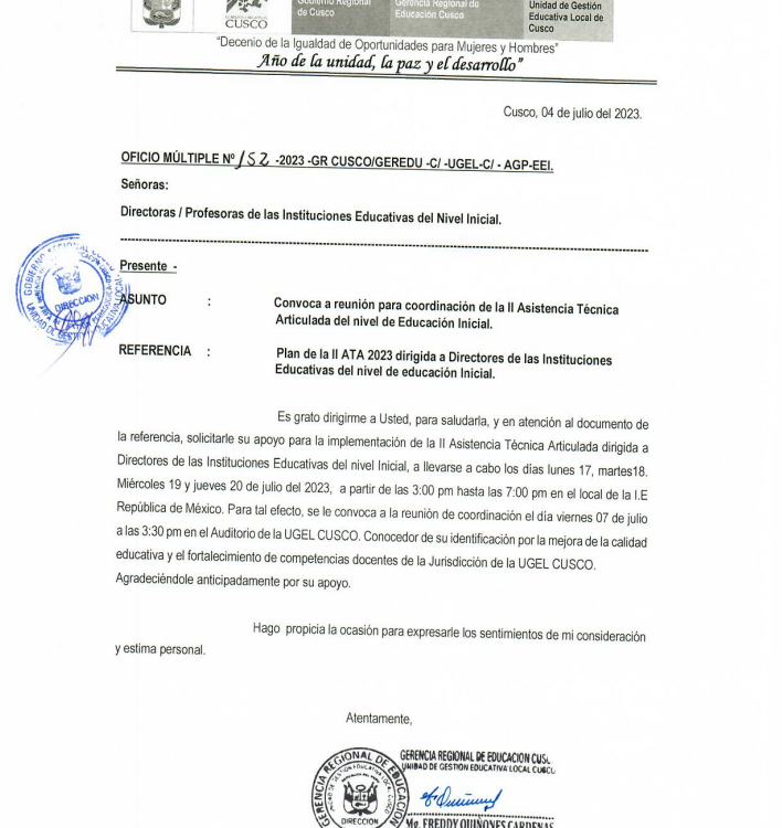 OFICIO MULTIPLE N° 152-2023-GR CUSCO/GEREDU-C/UGEL-C/-AGP-EEI.