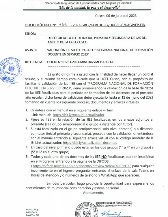 OFICIO MULTIPLE N° 155-2023-GR CUSCO/GEREDU-C/UGEL-C/-AGP-EIB.