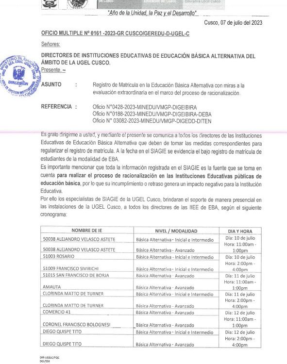 OFICIO MULTIPLE N° 161-2023-GR CUSCO/GEREDU-D-UGEL-C
