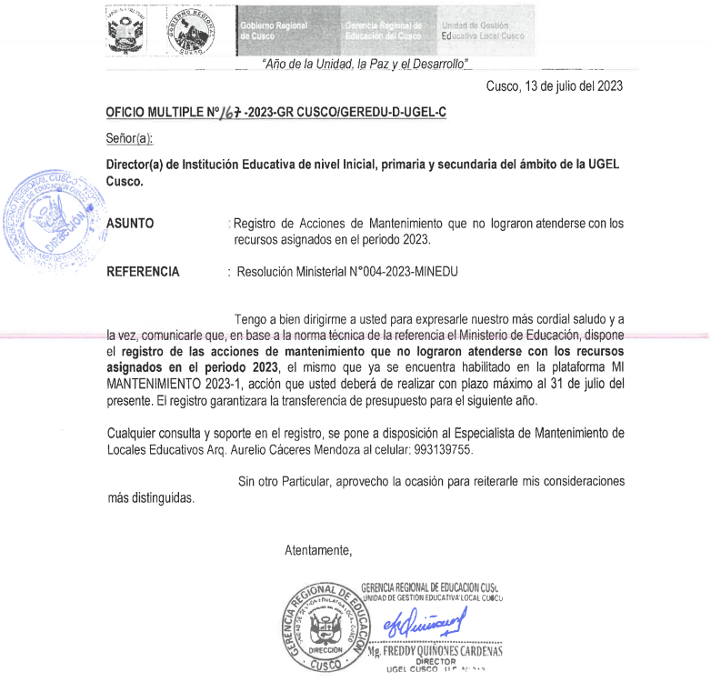 OFICIO MULTIPLE N° 167-2023-GR CUSCO/GEREDU-D-UGEL-C