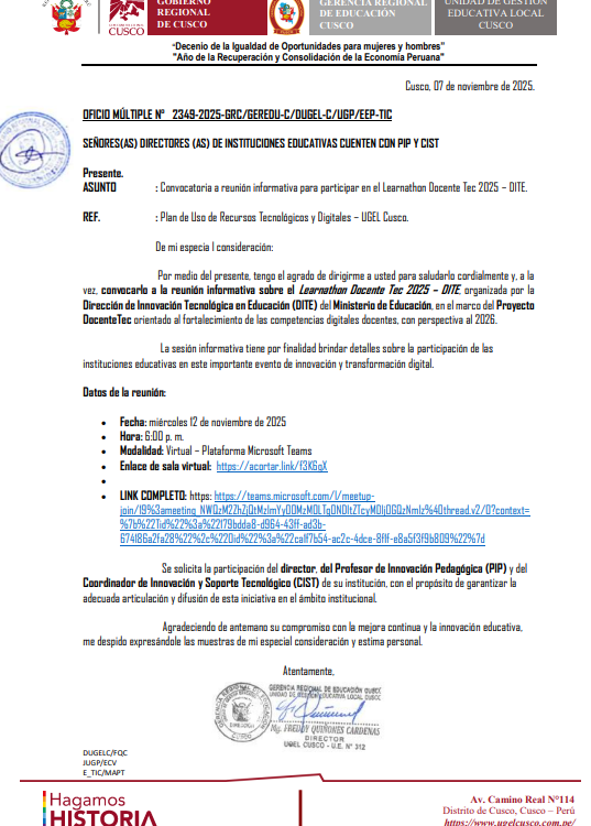 OFICIO MULTIPLE N° 2349-2025-GRC/GEREDU-C/DUGEL-C/UGP/EEP-TIC