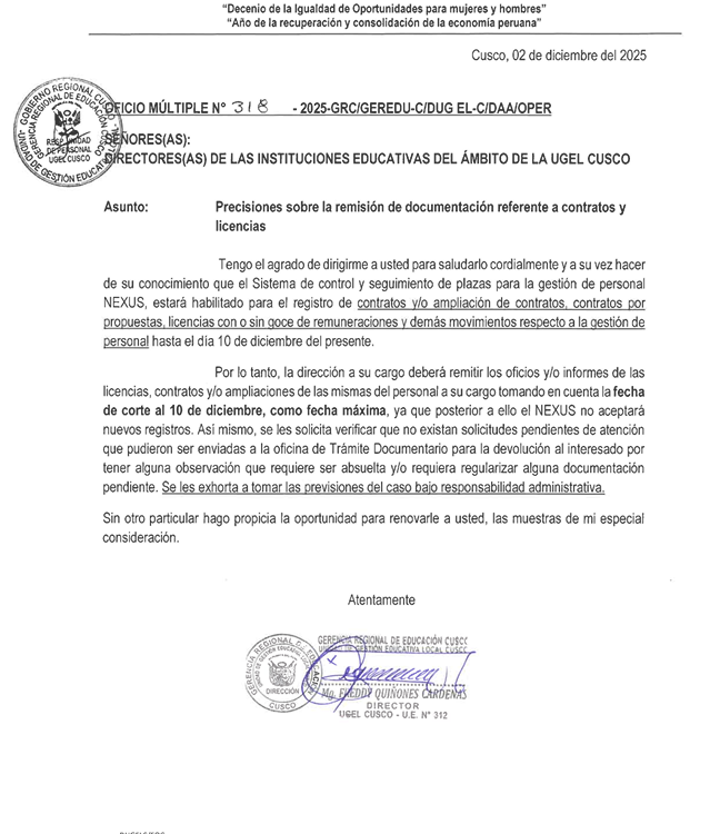 02 Dic 2025 Dimas Gamarra Ortiz de Zevallos Oficios 2 de diciembre de 2025 OFICIO MULTIPLE N° 318-2025-GRC/GEREDU-C/DUGEL-C/DAA/OPER ASUNTO: PRECISIONES SOBRE LA REMISIÓN DE DOCUMENTACIÓN REFERENTE A CONTRATO Y LICENCIA Anterior Noticia Siguiente Noticia