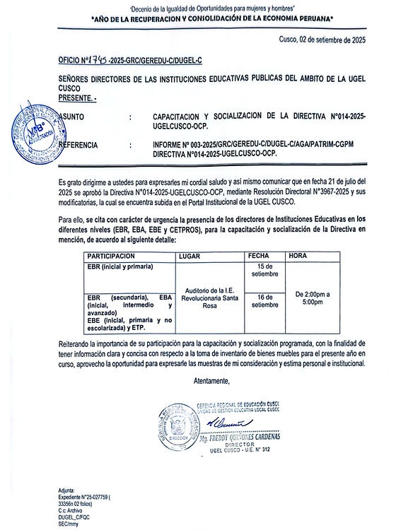 ASUNTO: CAPACITACIÓN Y SOCIALIZACIÓN DE LA DIRECTIVA N° 014-2025-UGEL CUSCO-OCP