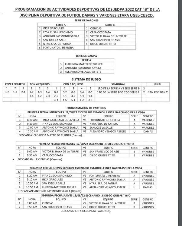 16 Ago 2022 Ugel Cusco Comunicados 16 de agosto de 2022 PROGRAMACION DE ACTIVIDADES DEPORTIVAS DE LOS JEDPA 2022 CAT»B» DE LA DICIPLINA DEPORTIVA DE FUTBOL DAMAS Y VARONES ETAPA UGEL – CUSCO LEER MAS Anterior Noticia Siguiente Noticia