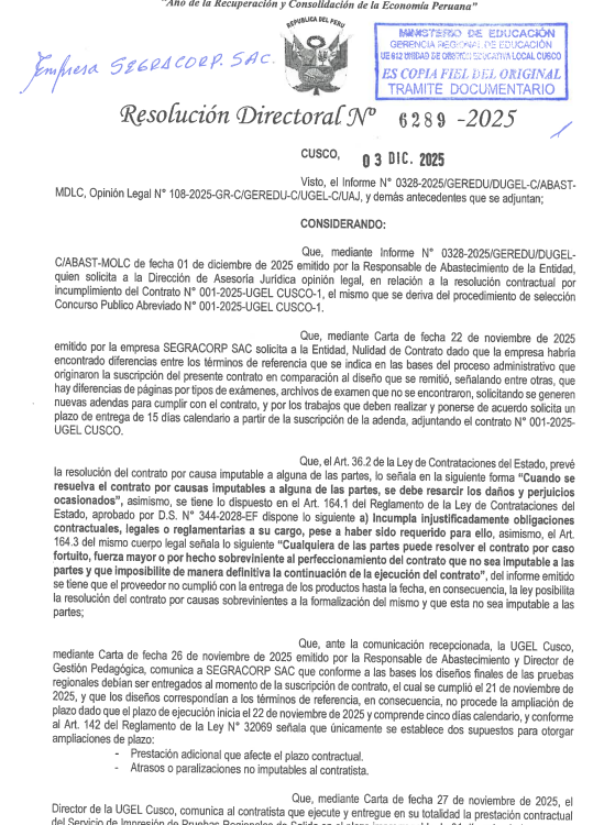 10 Dic 2025 Ugel Cusco Directivas 10 de diciembre de 2025 Resolución Directoral N.° 6289-2025 RESOLVER EL CONTRATO N° 001-2025-UGEL CUSCO, EN FORMA TOTAL Anterior Noticia Siguiente Noticia